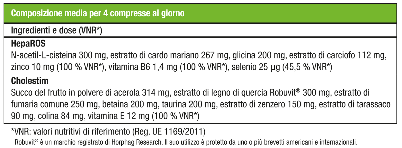 Contiene inoltre betaina, colina, estratto di fumaria ed estratto di quercia Robuvit®.